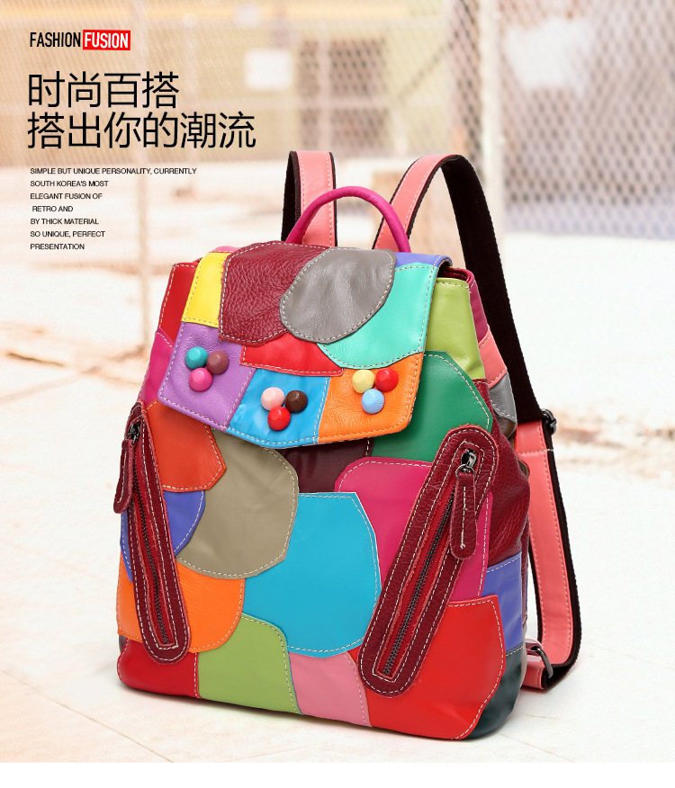 时尚休闲彩色真皮单肩手提双肩背包经典百搭拼接撞色女士背包