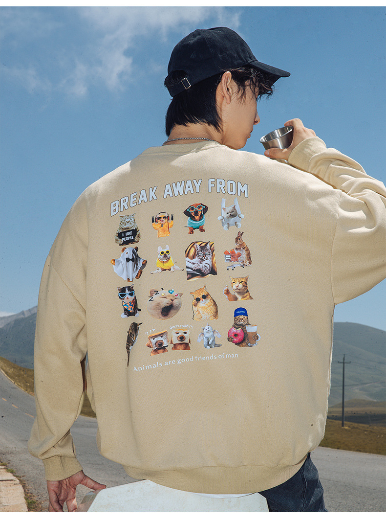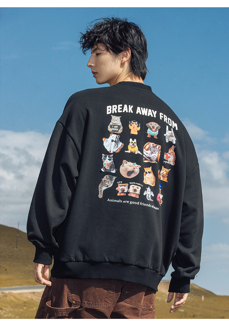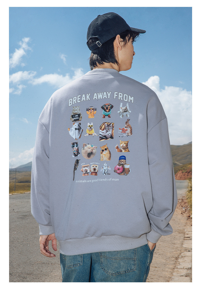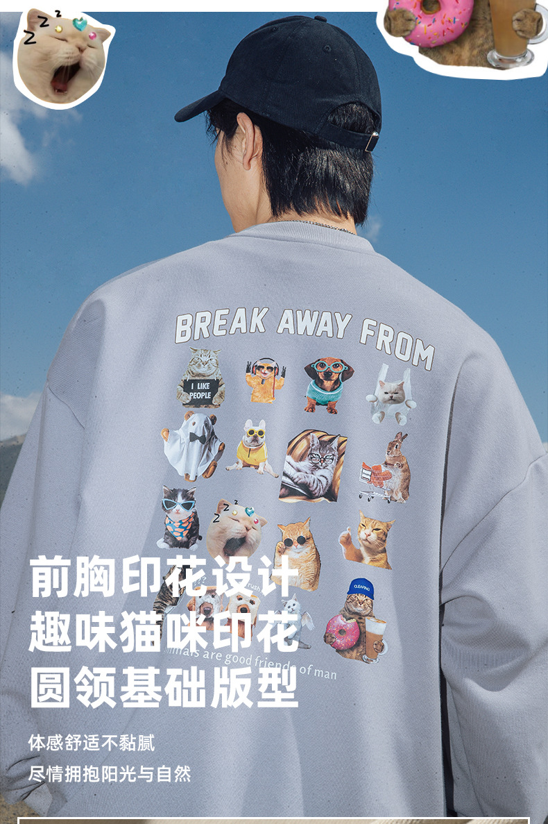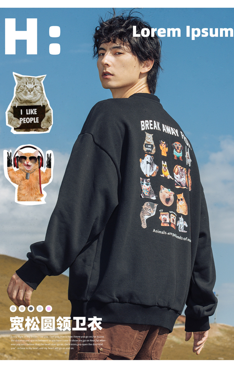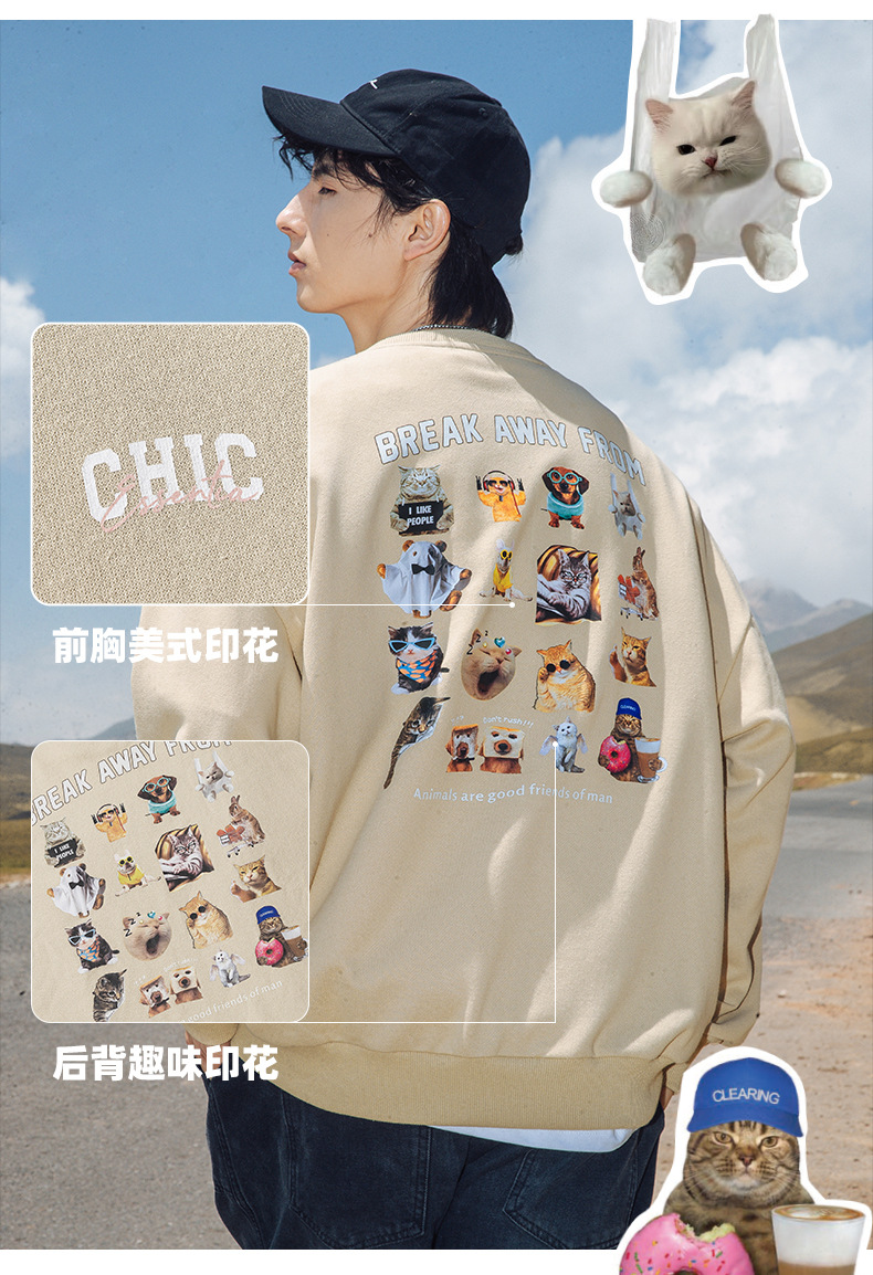 韩路男装 趣味卡通印花美式卫衣男新款重磅宽松情侣圆领外套