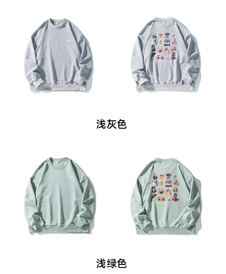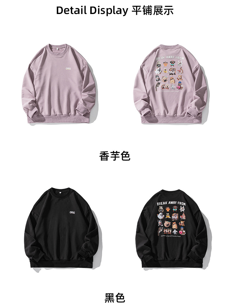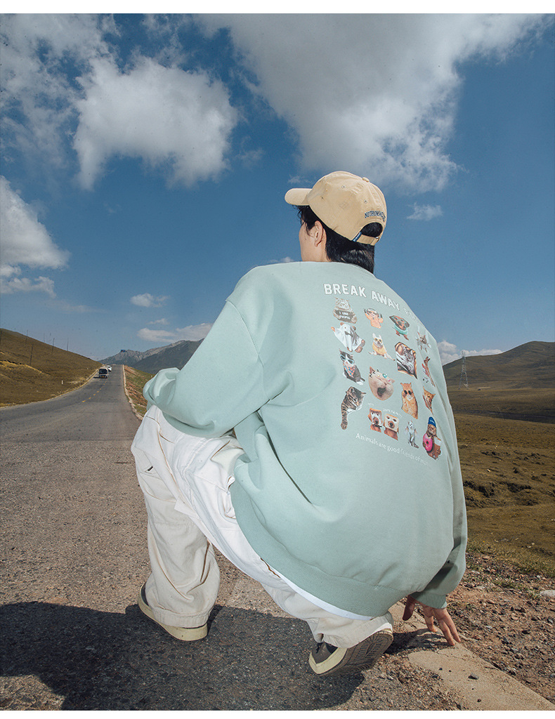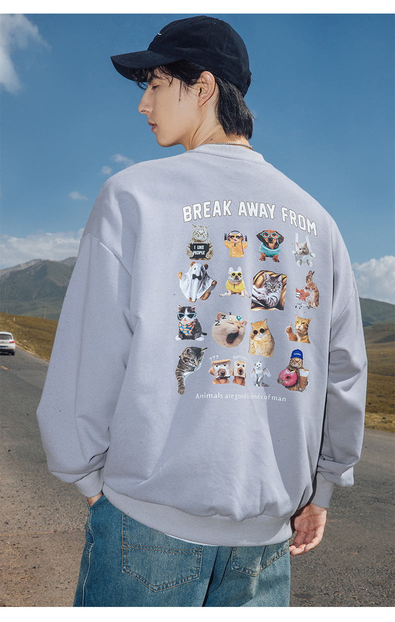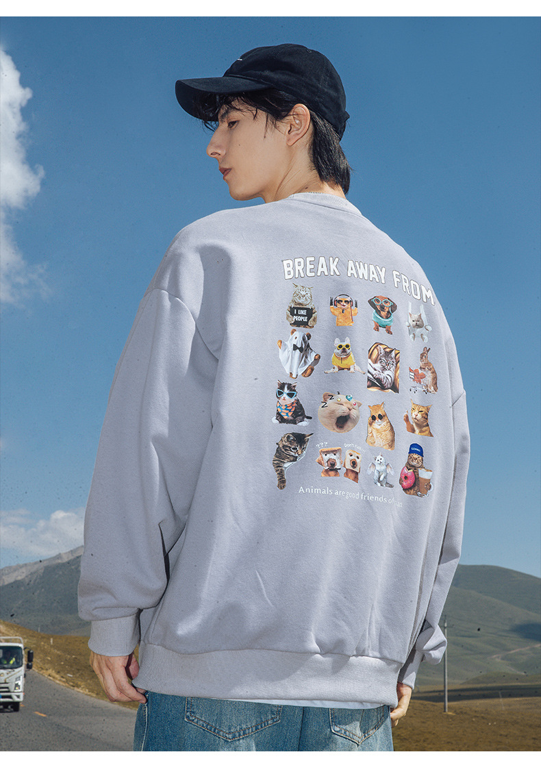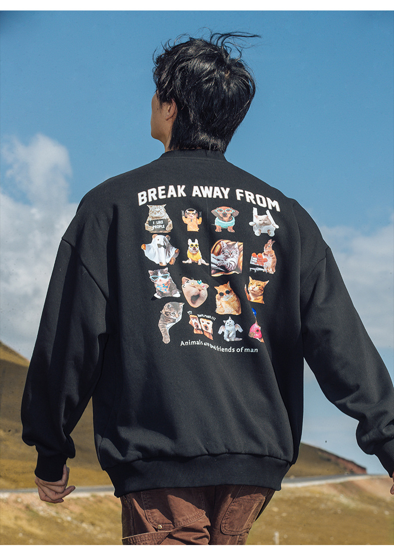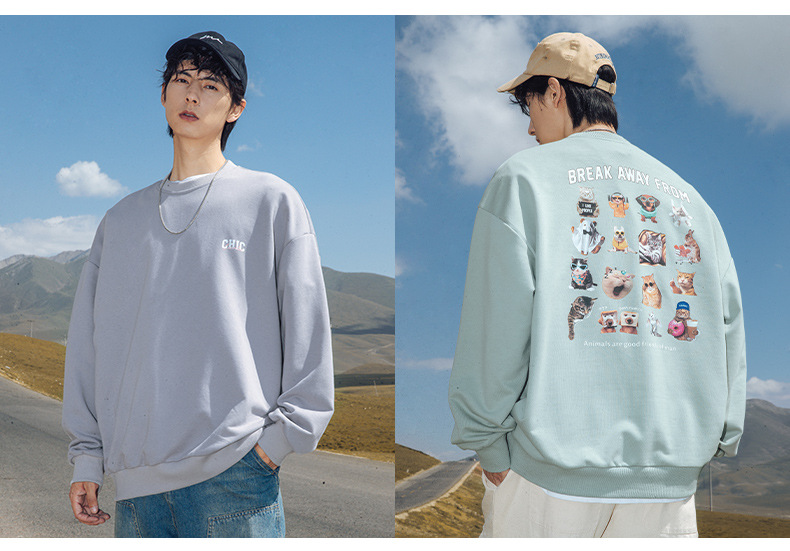 韩路男装 趣味卡通印花美式卫衣男新款重磅宽松情侣圆领外套