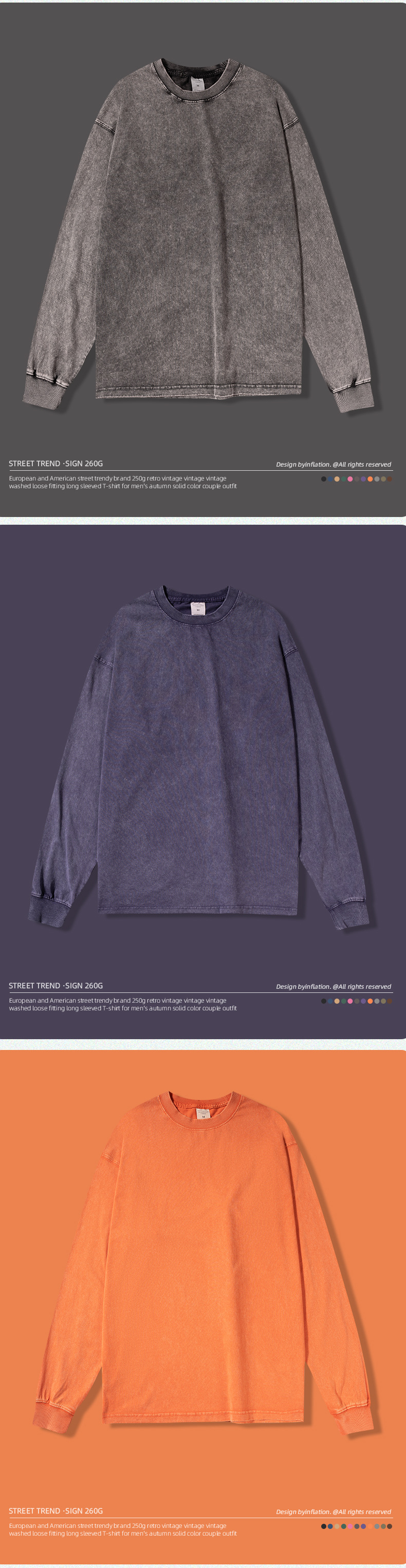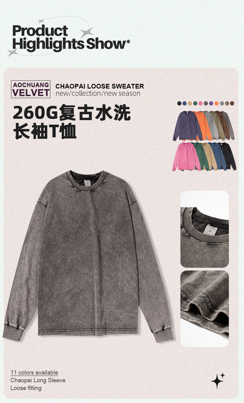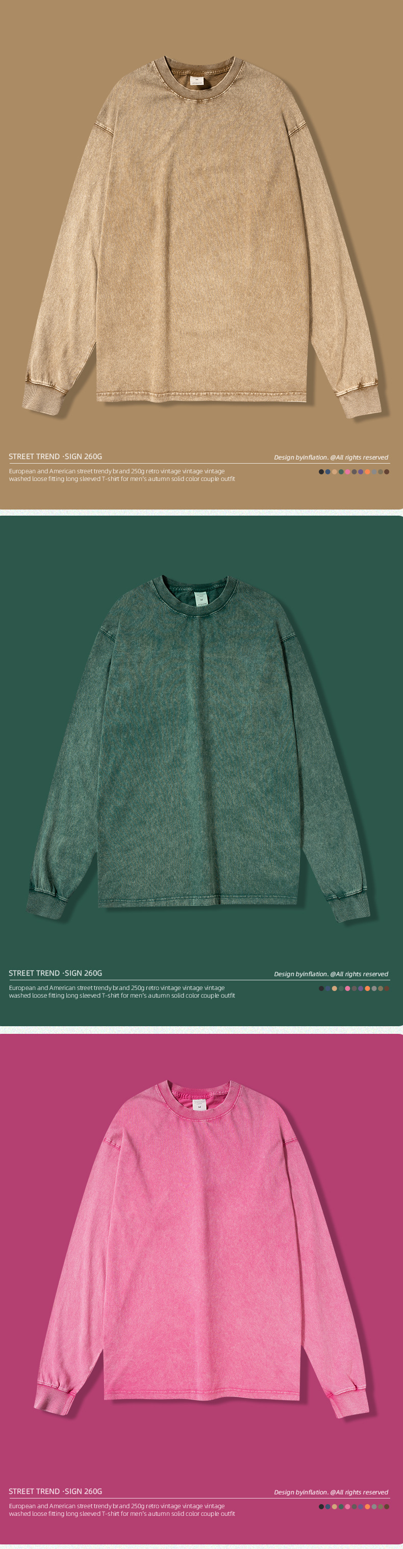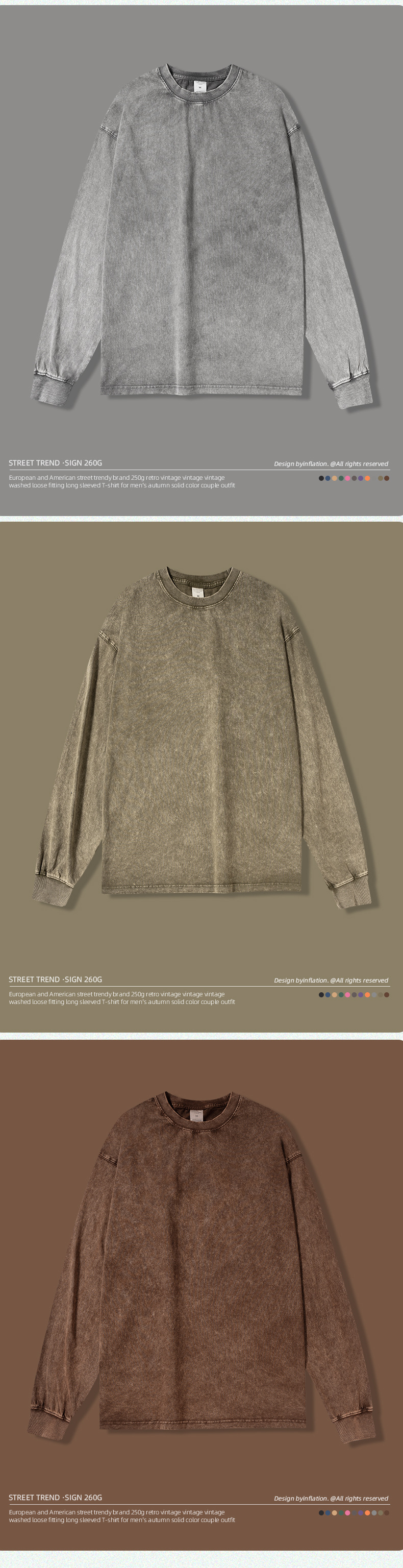 BK男装|260g做旧复古重磅长袖t恤男水洗棉Oversize落肩T恤打底衫