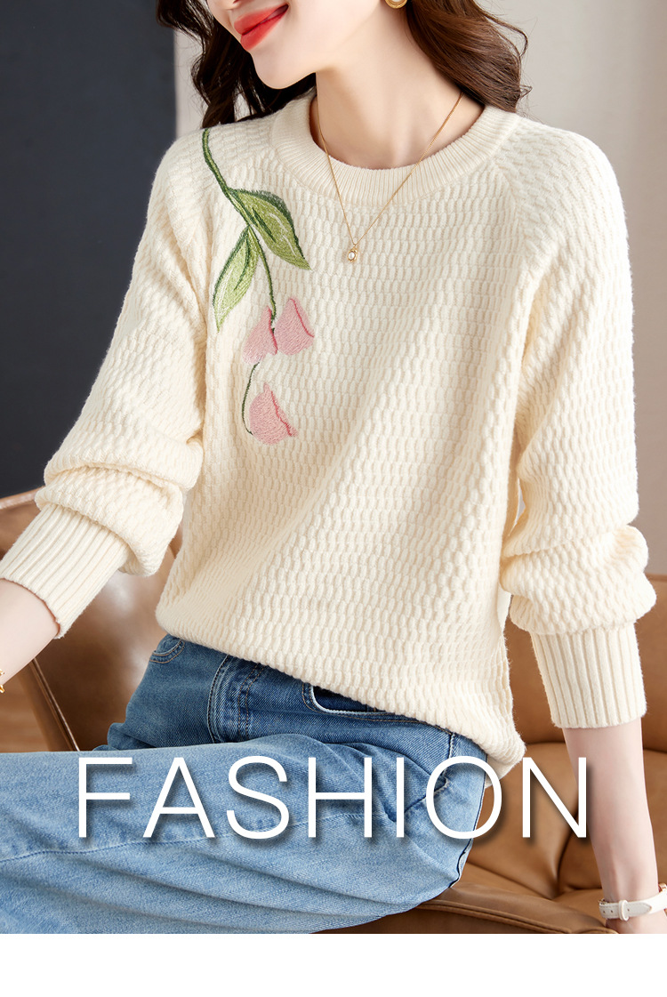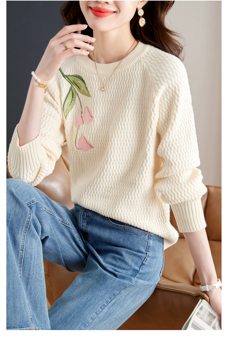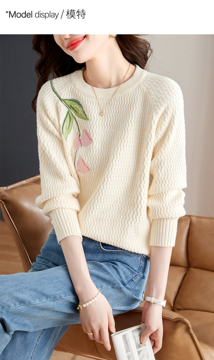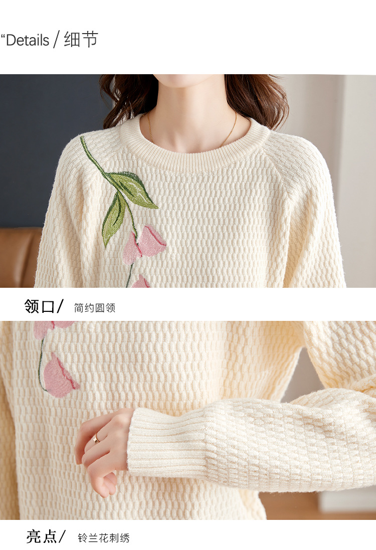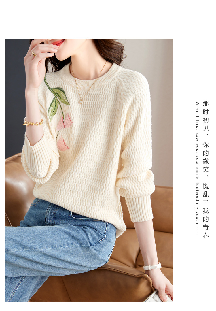 提花刺绣圆领针织衫女装设计感小众宽松毛衣打底衫