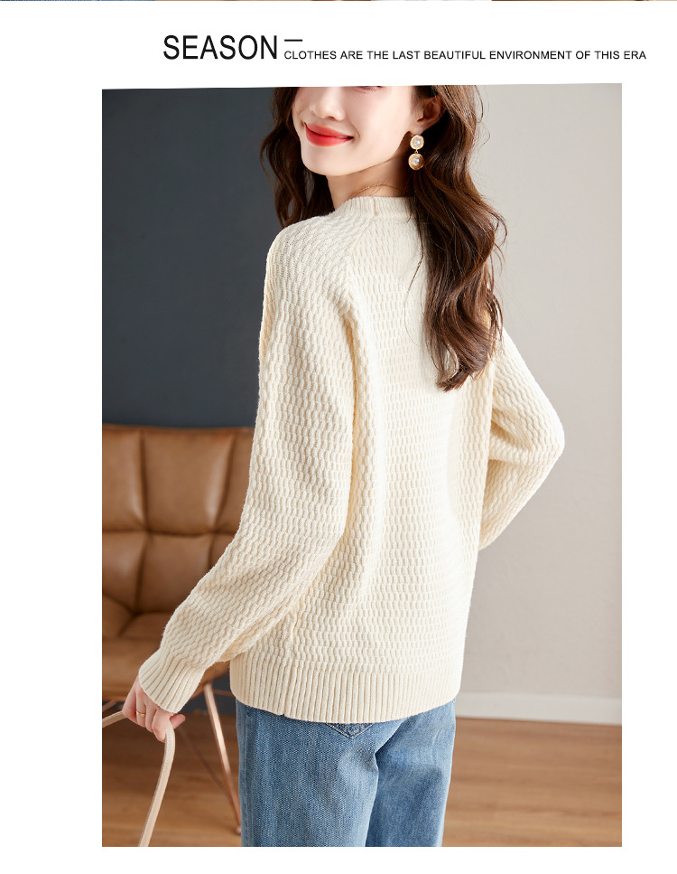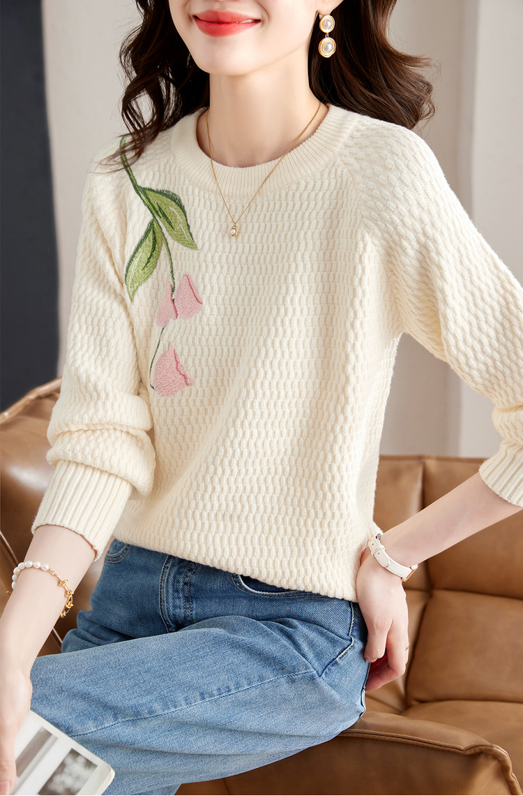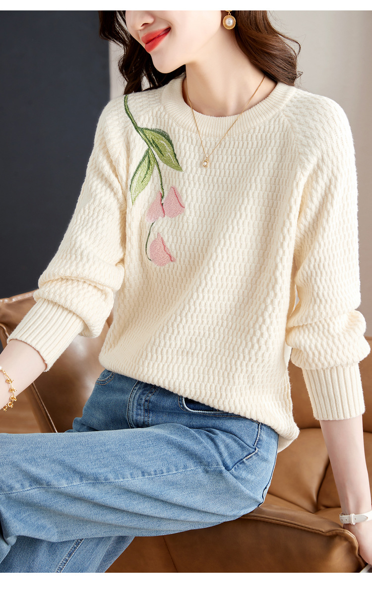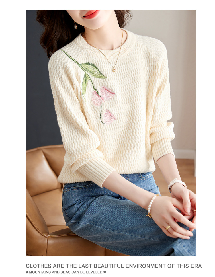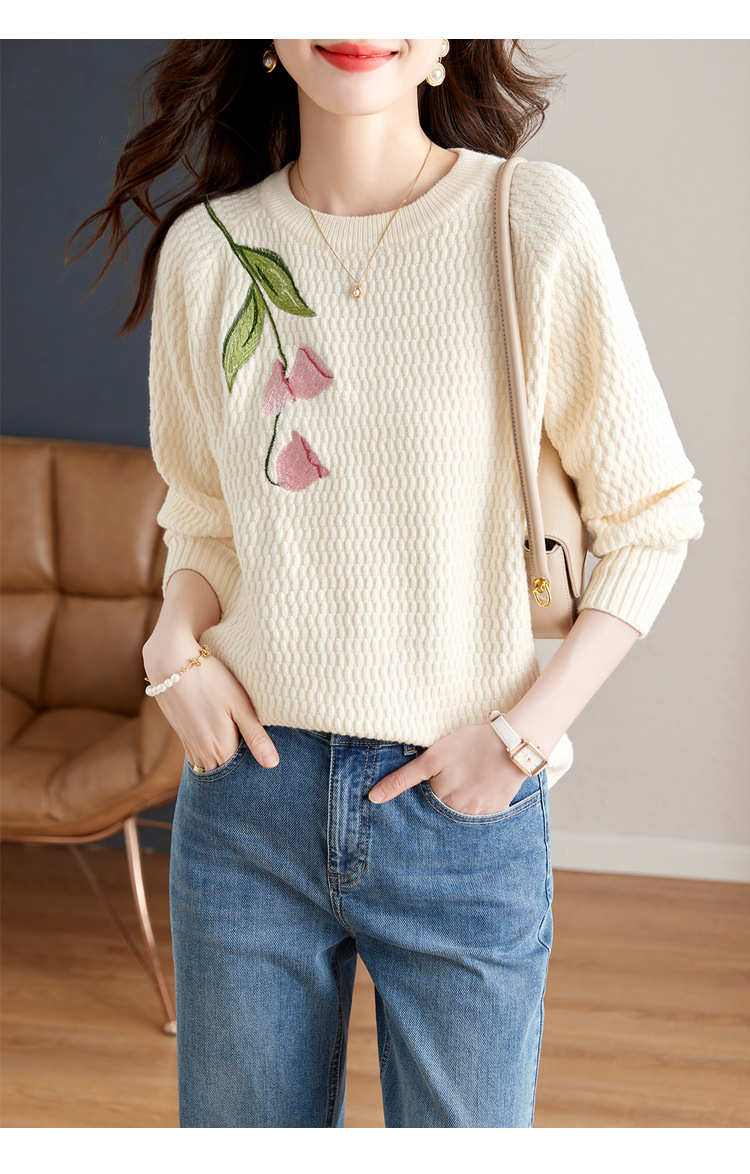 提花刺绣圆领针织衫女装设计感小众宽松毛衣打底衫