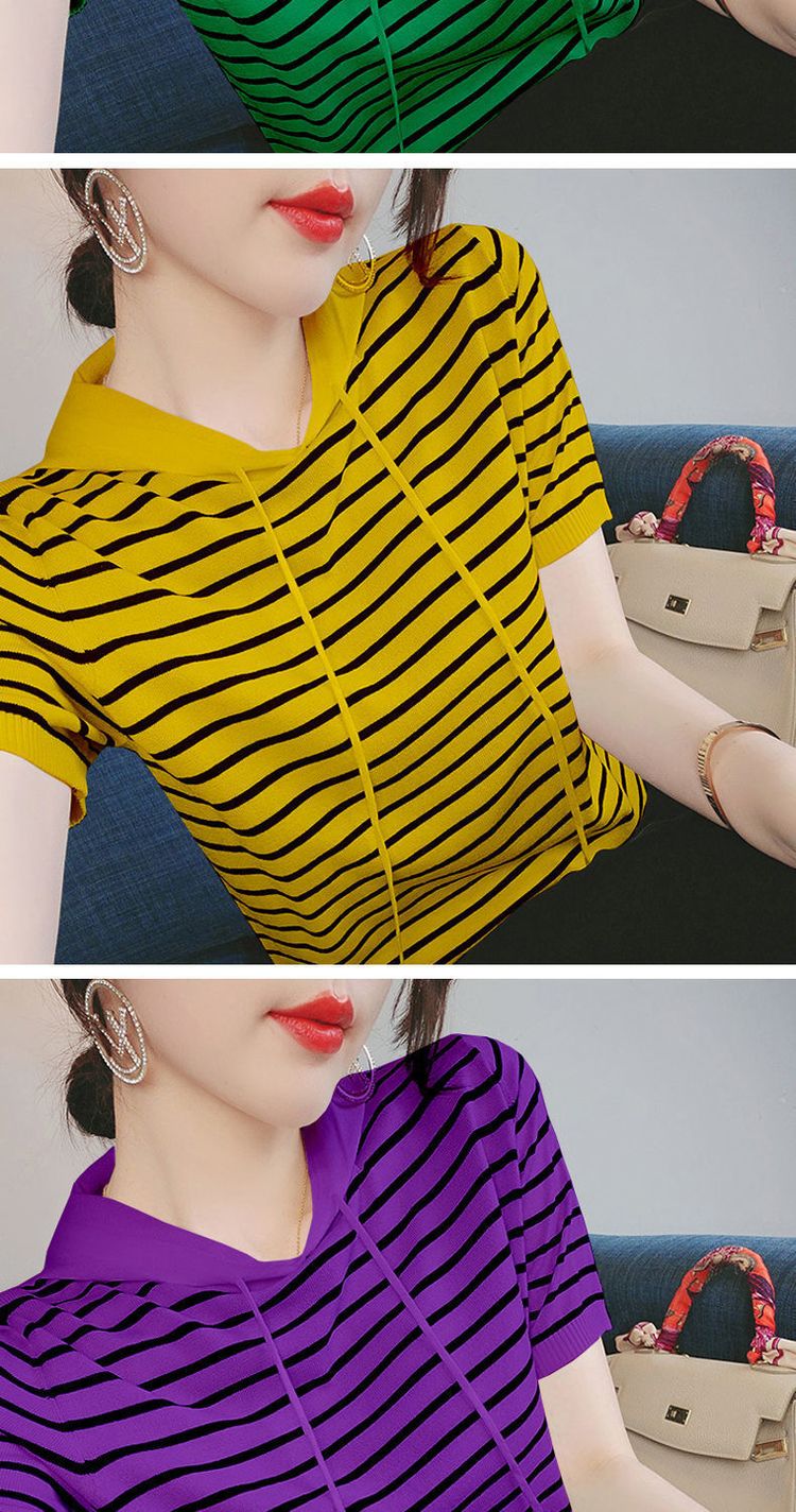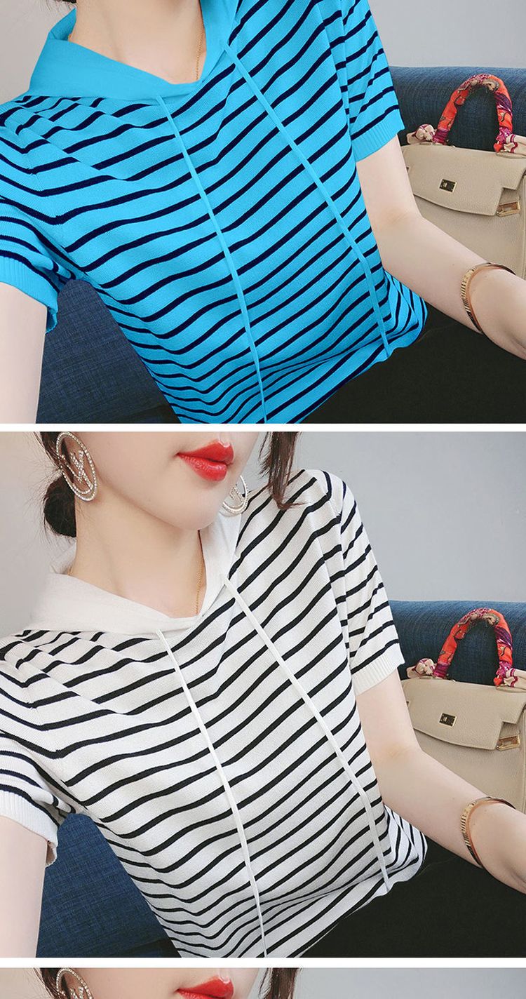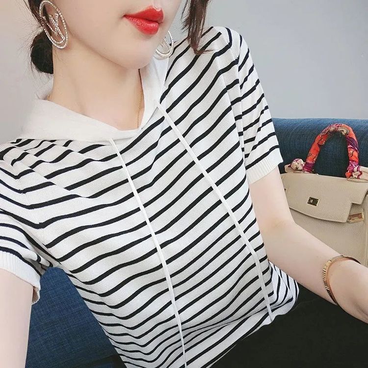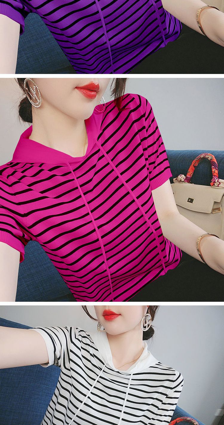 冰丝短袖女连帽上衣新款女装韩版款宽松百搭ins条纹T恤