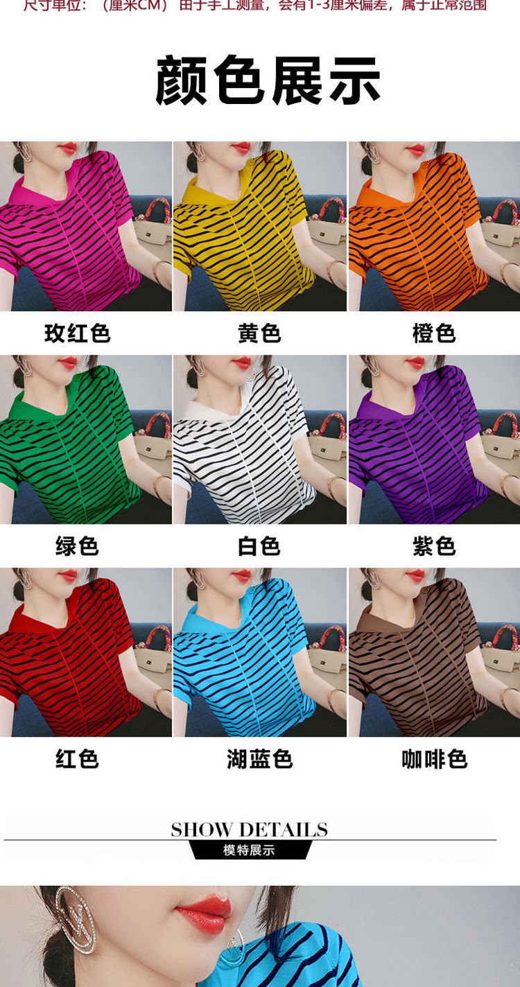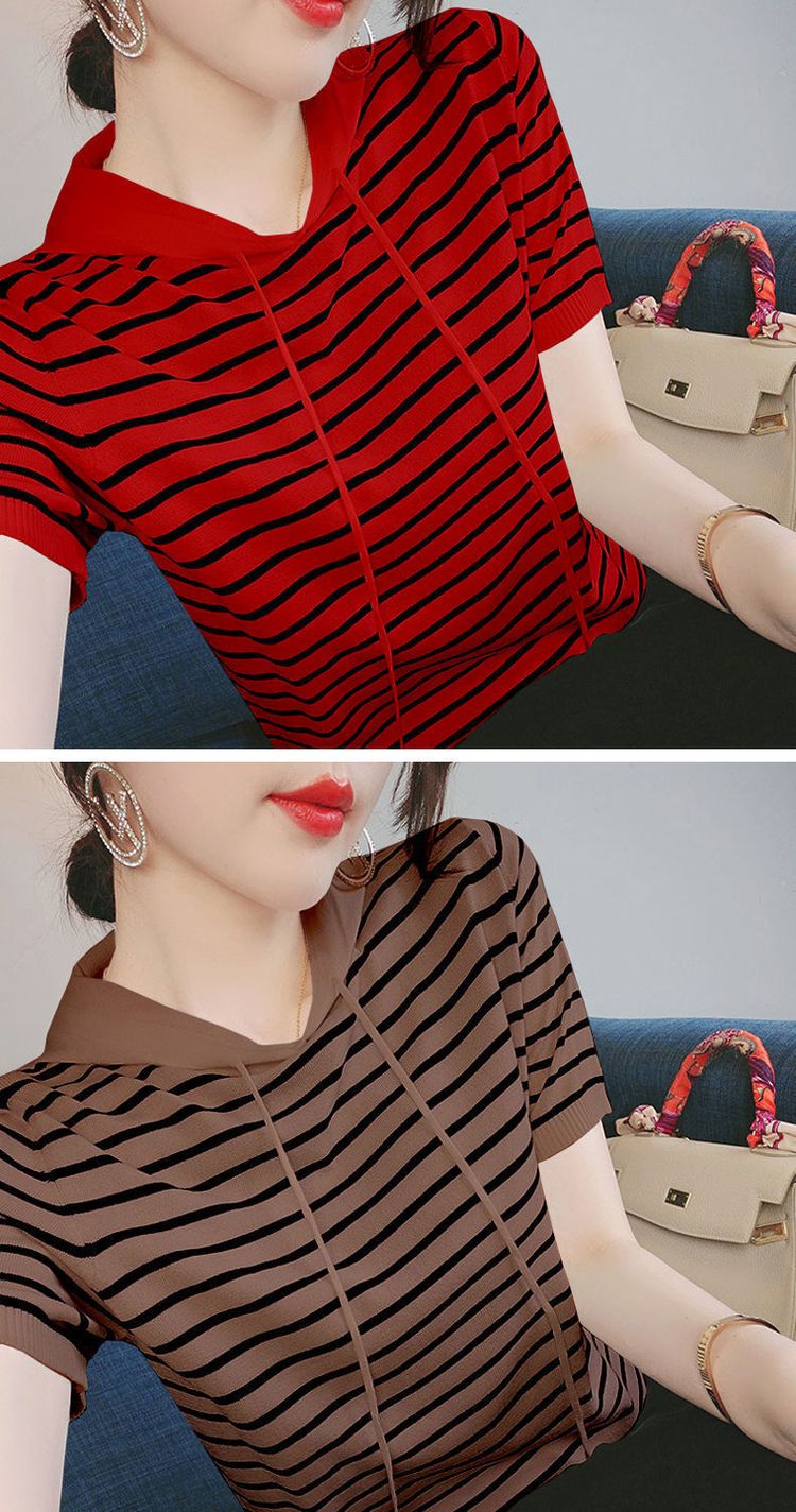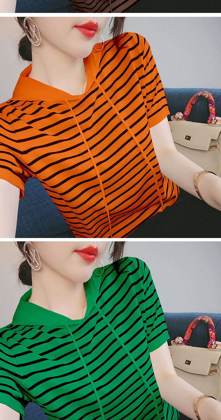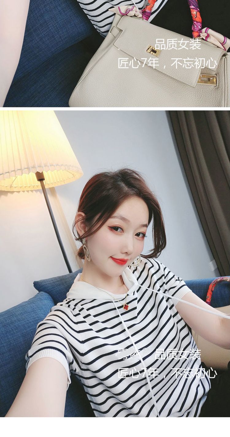 冰丝短袖女连帽上衣新款女装韩版款宽松百搭ins条纹T恤